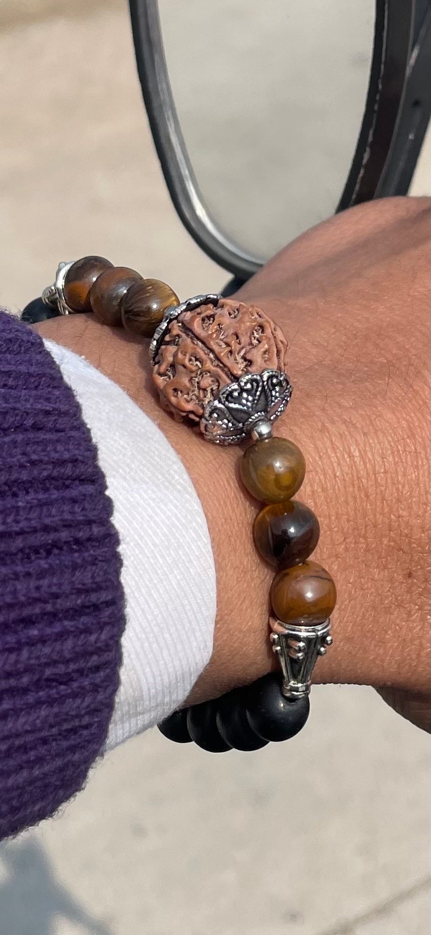 - Tiger's Eye Beads: The golden-brown shimmering beads next to the Rudraksha are Tiger's Eye, a stone believed to promote confidence, willpower, and mental clarity.